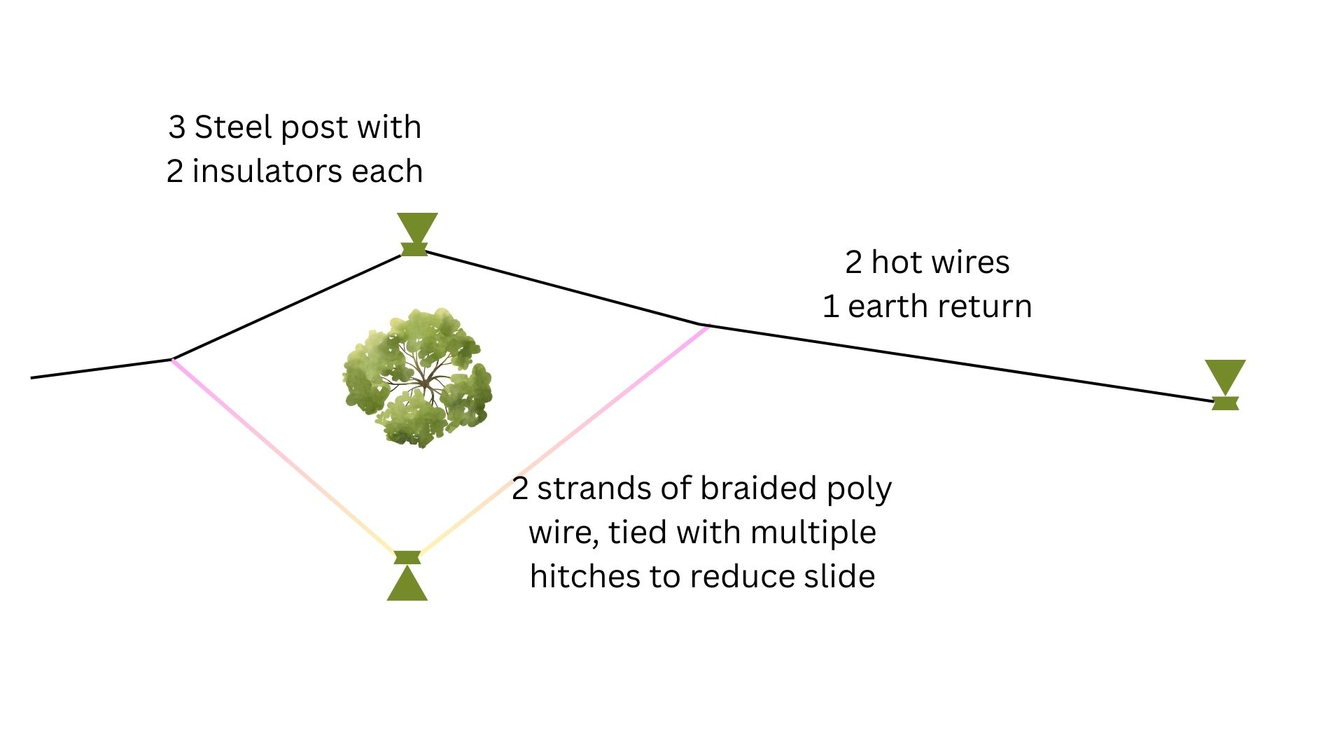 Each tree site has a steel post each side. The top post forms part of the fence. There are two hot wires through the fence and one earth wire. The earth wire is crucial in completing the circuit. The wires are not strained as you would do in a permanent, straight fence. I use gripples and pull the wires tight by hand. If there is too much strain, the end posts will bend over. I used normal steel posts. The end posts would be better if they were the MaxY style – deeper and stronger. This would increase cost though.