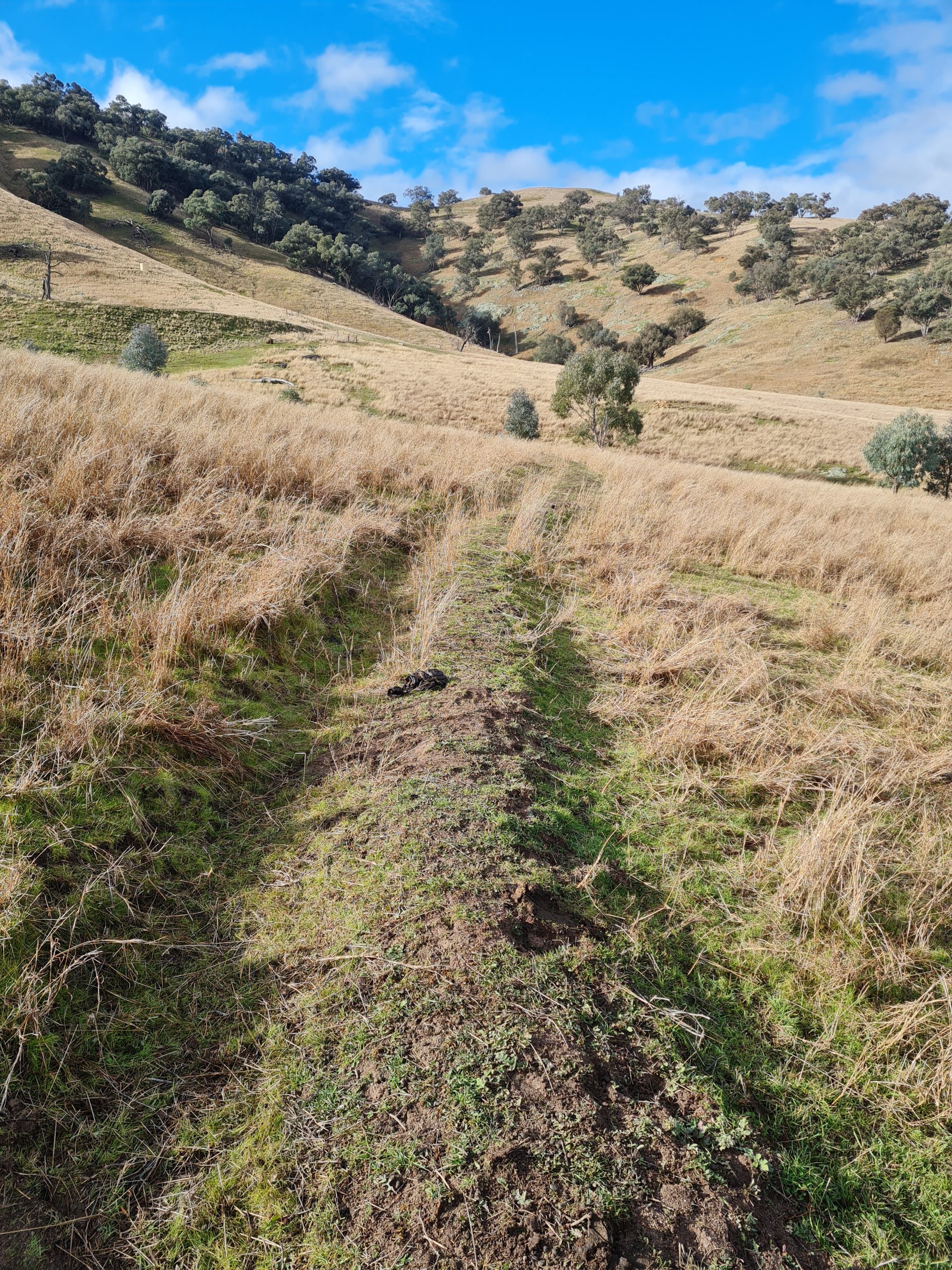 Our swales are made every 25 to 30m down the slope. This depends on the length of the slope and how steep it is. I paced the length of the paddock and divided the distance by 25m or so.