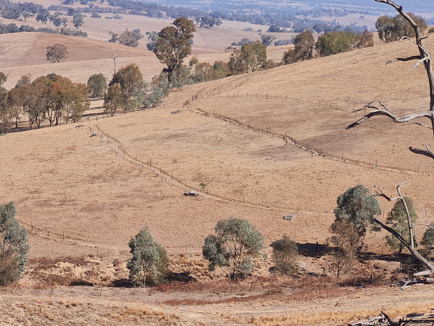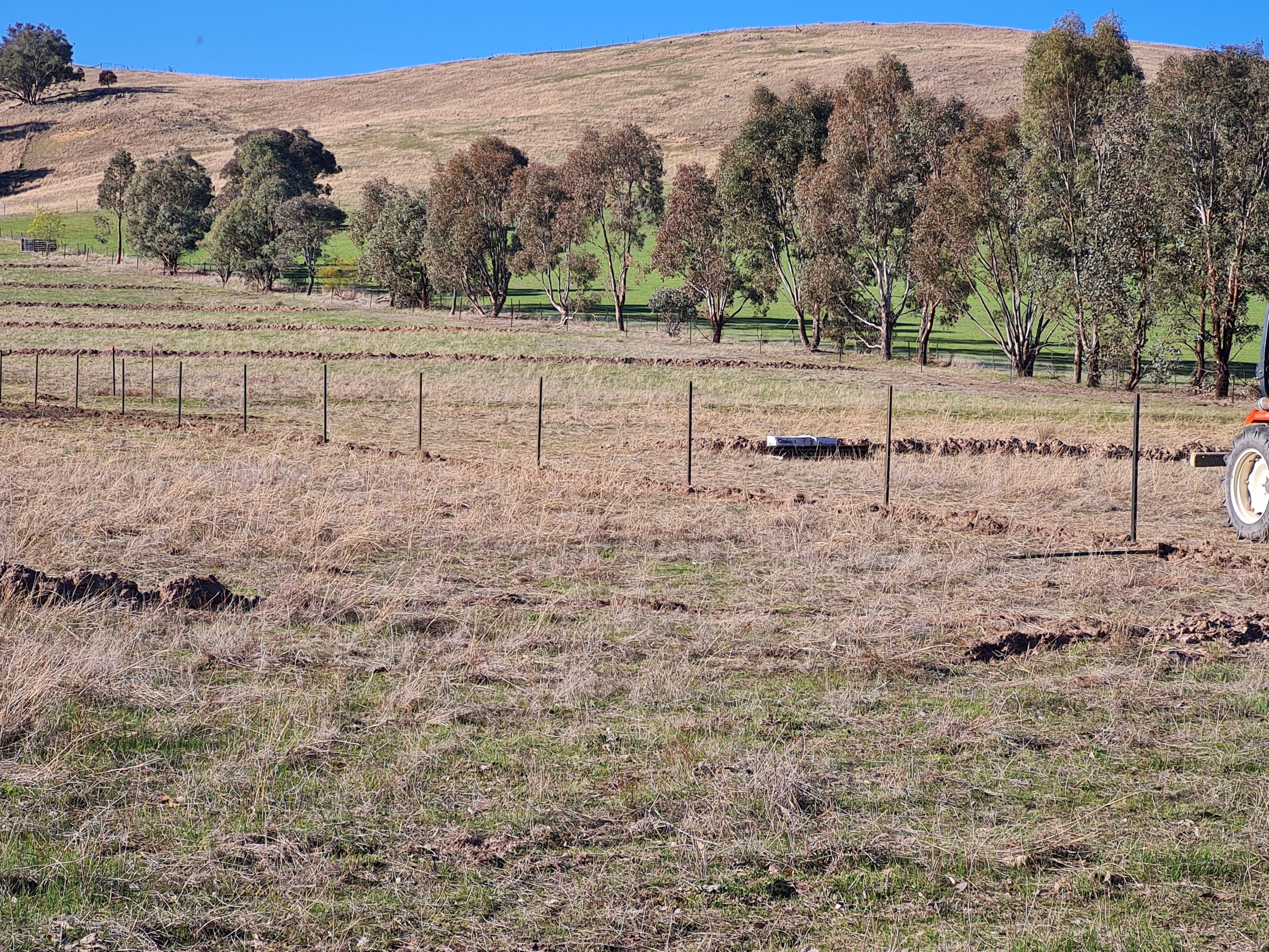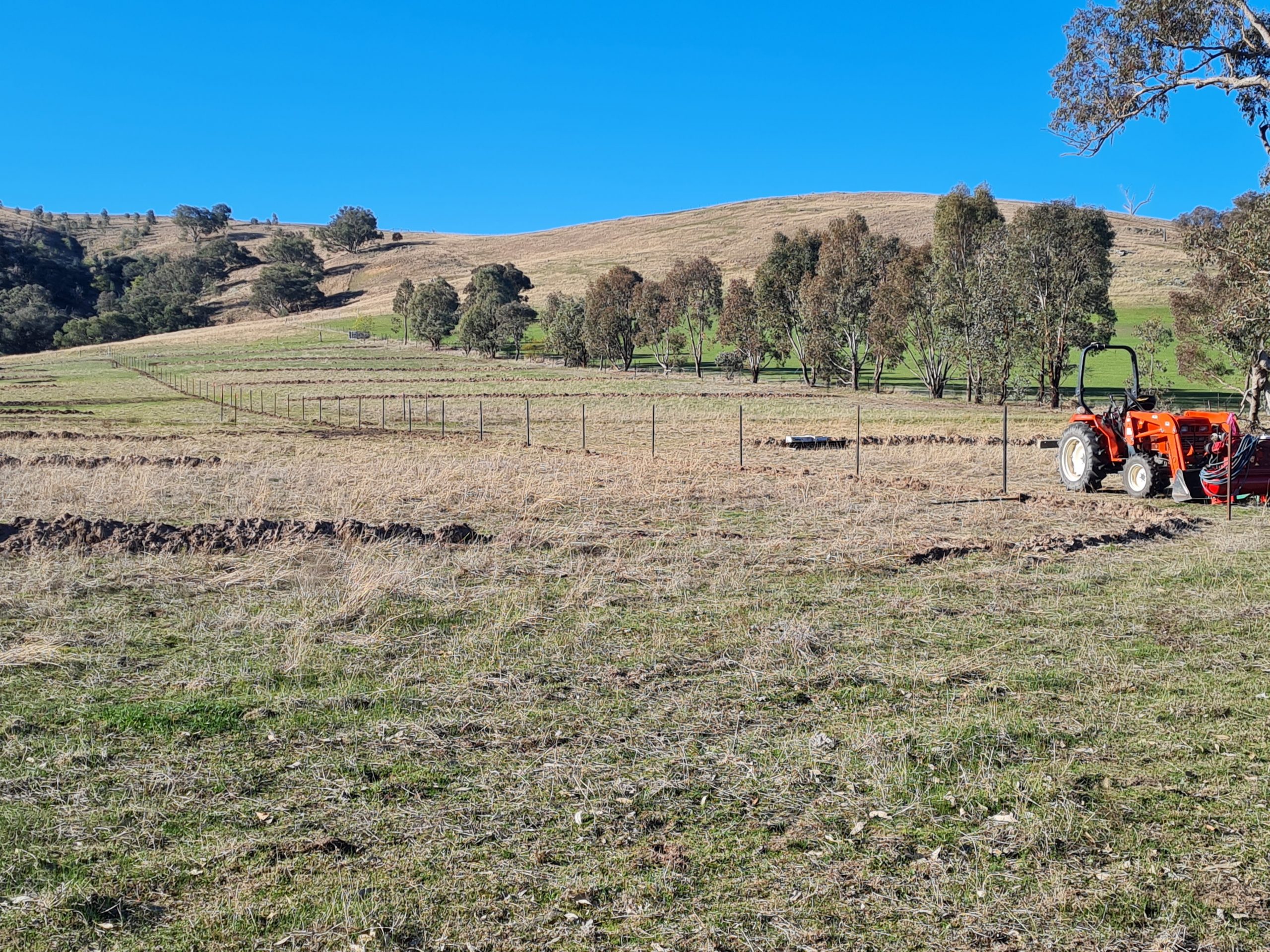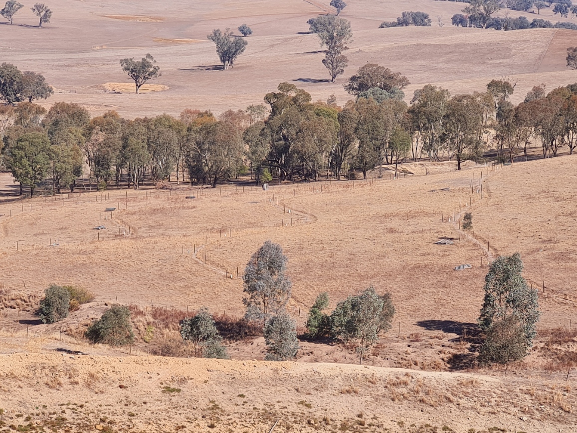 Here are some photos of the prototype system. The young trees can be seen together with a more recent photo showing the growth. Birds are already using these saplings as corridors to cross the paddock. The second photo was taken during the 2025 drought.