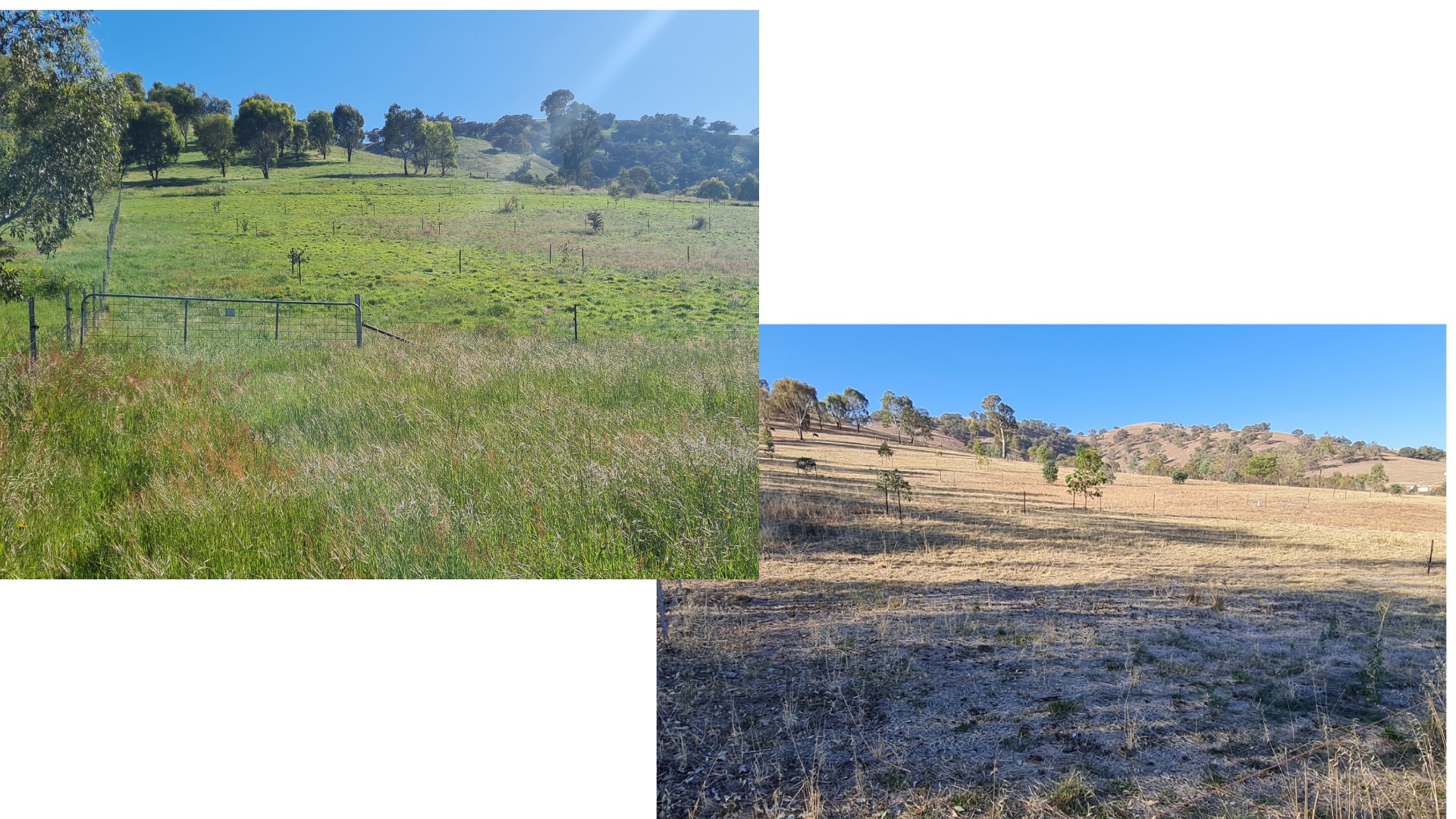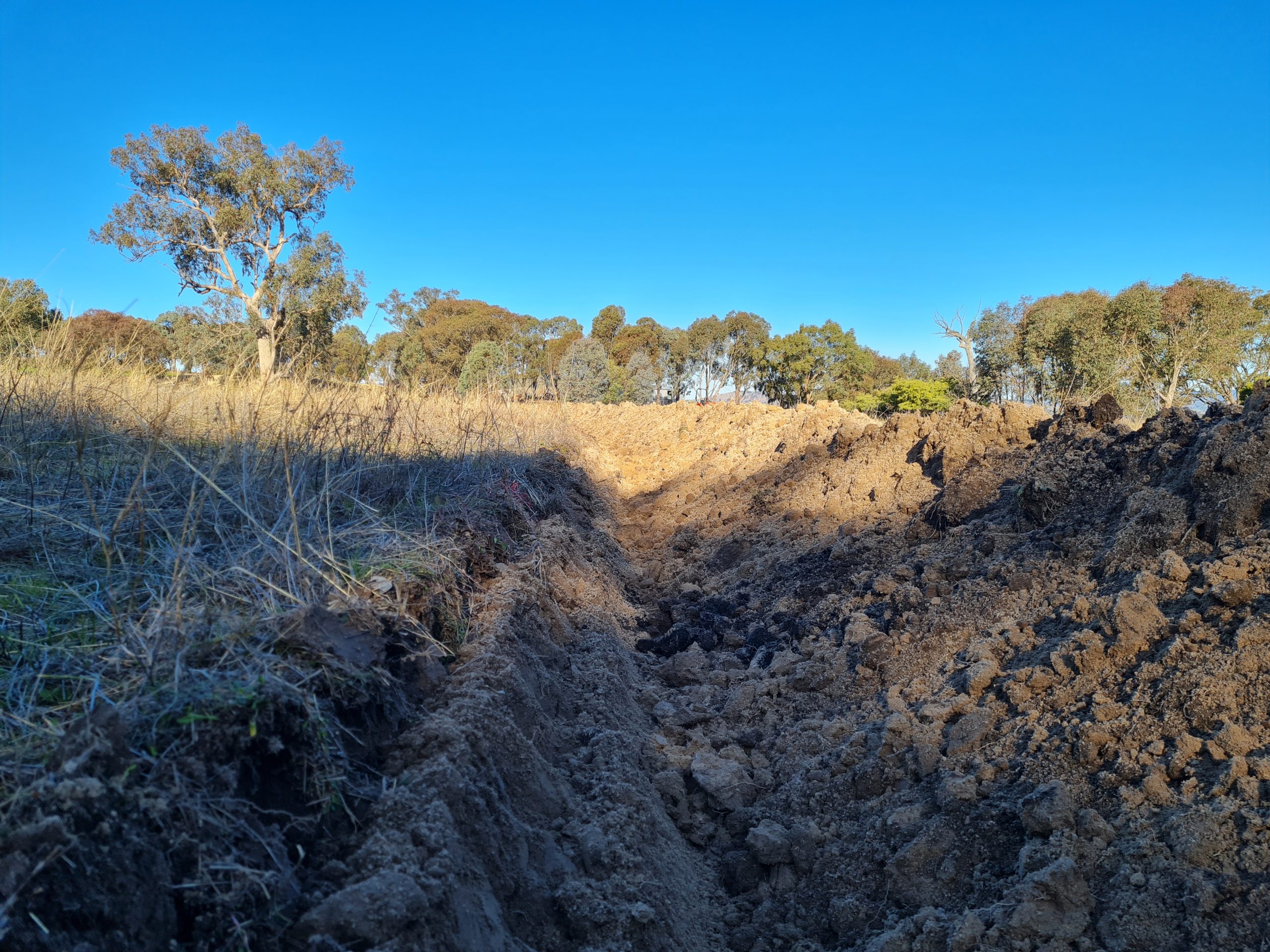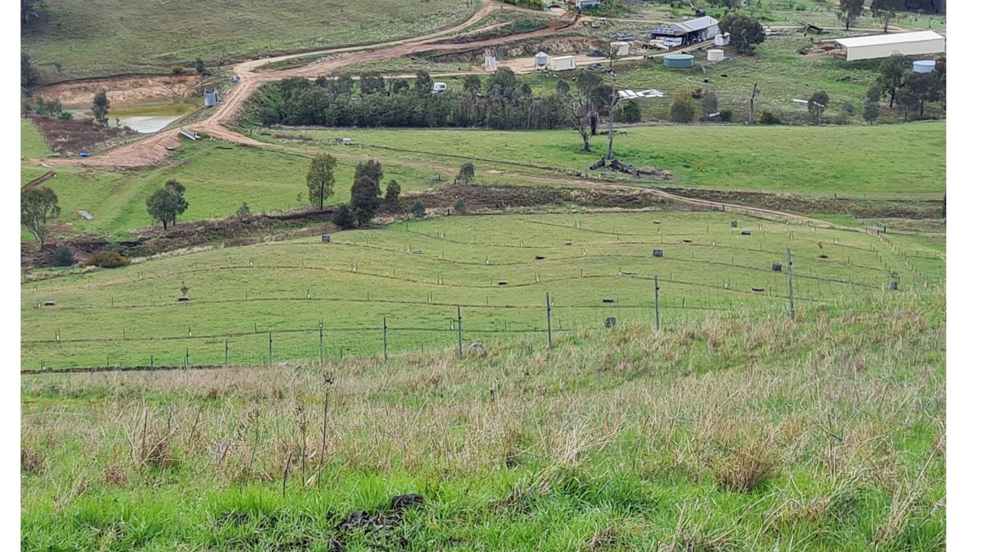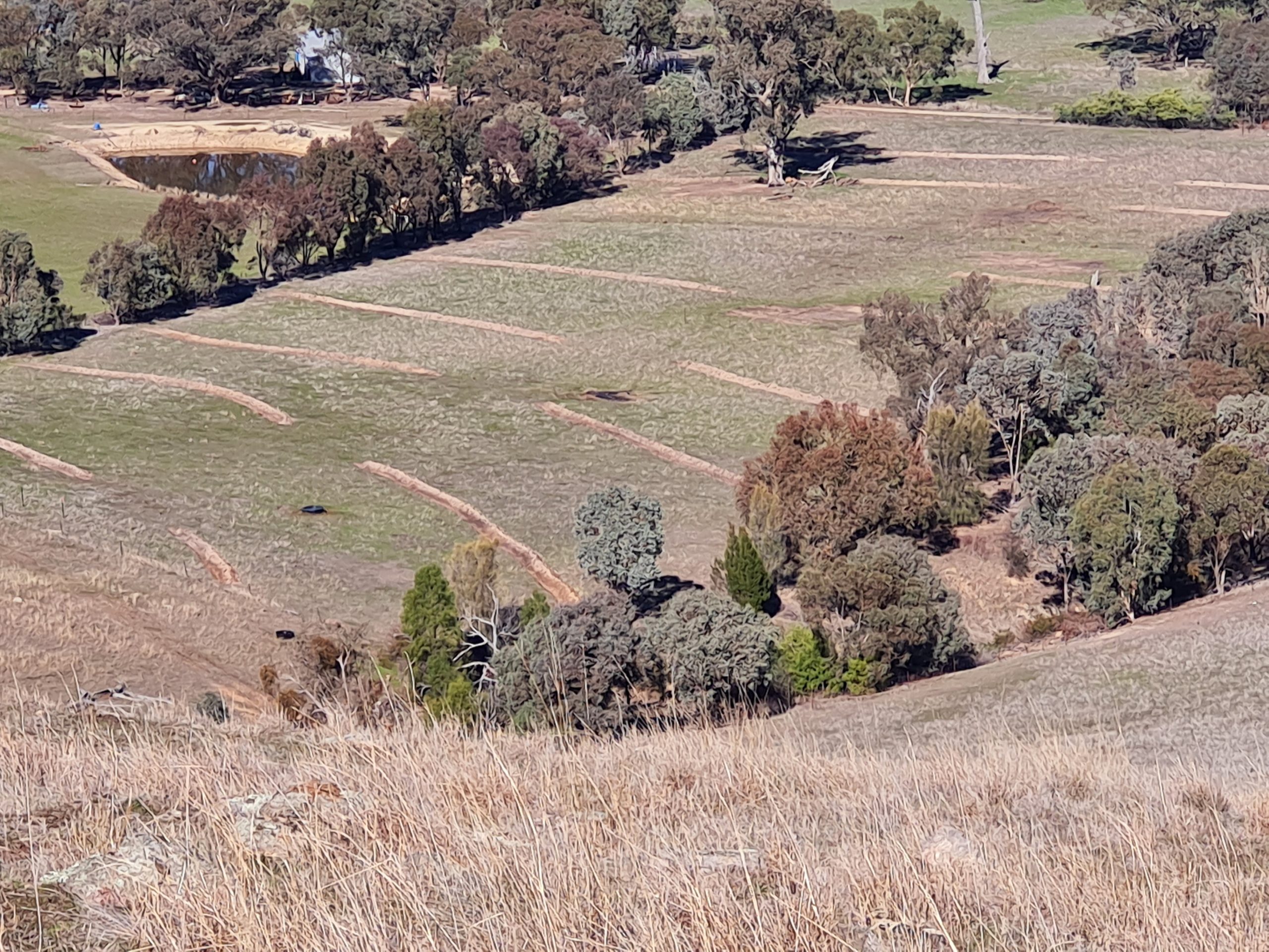 Here are some photos of the prototype system. The young trees can be seen together with a more recent photo showing the growth. Birds are already using these saplings as corridors to cross the paddock. The second photo was taken during the 2025 drought.