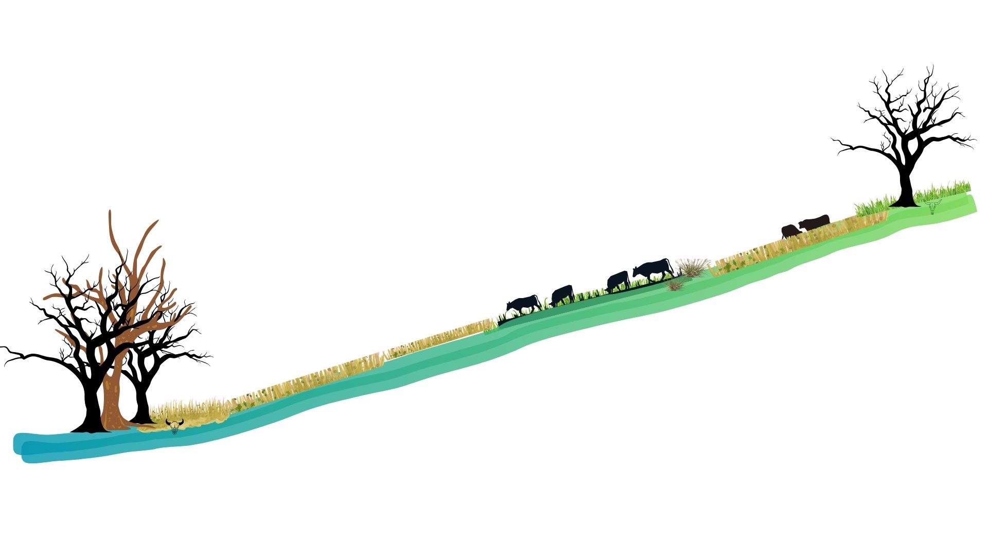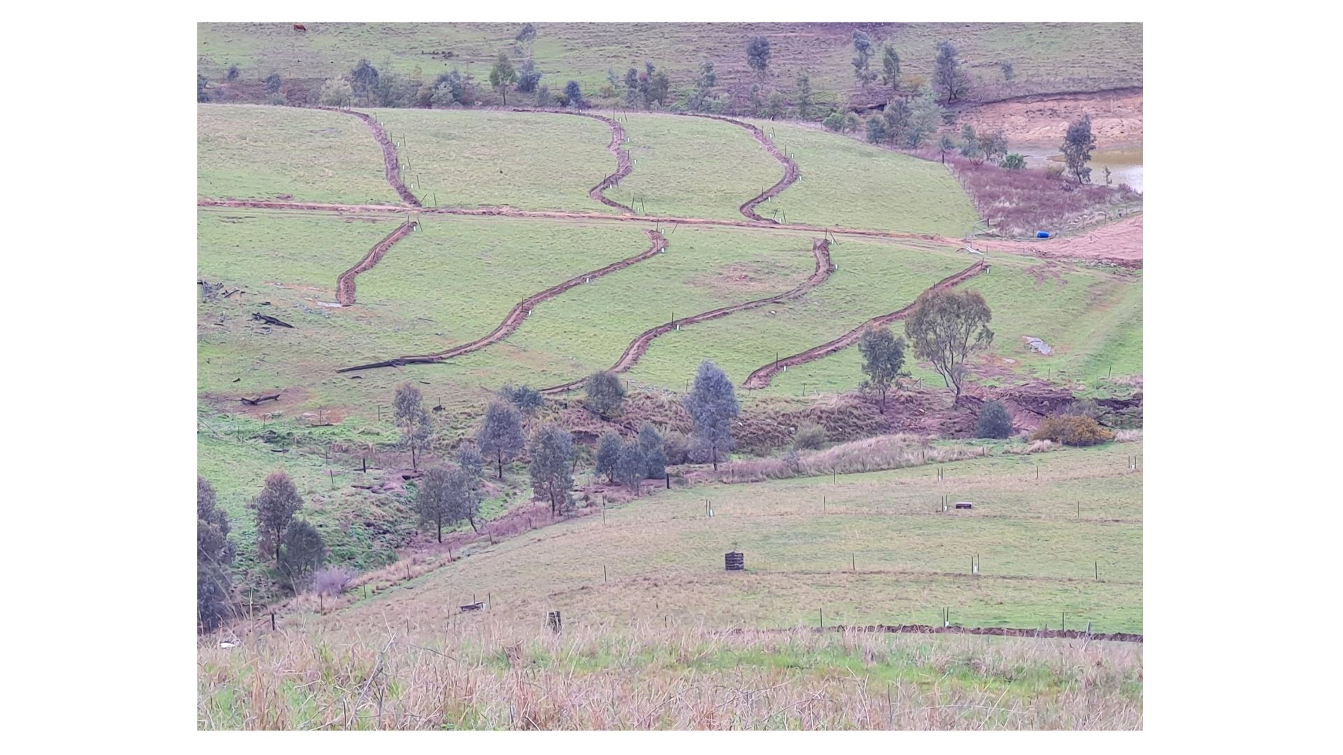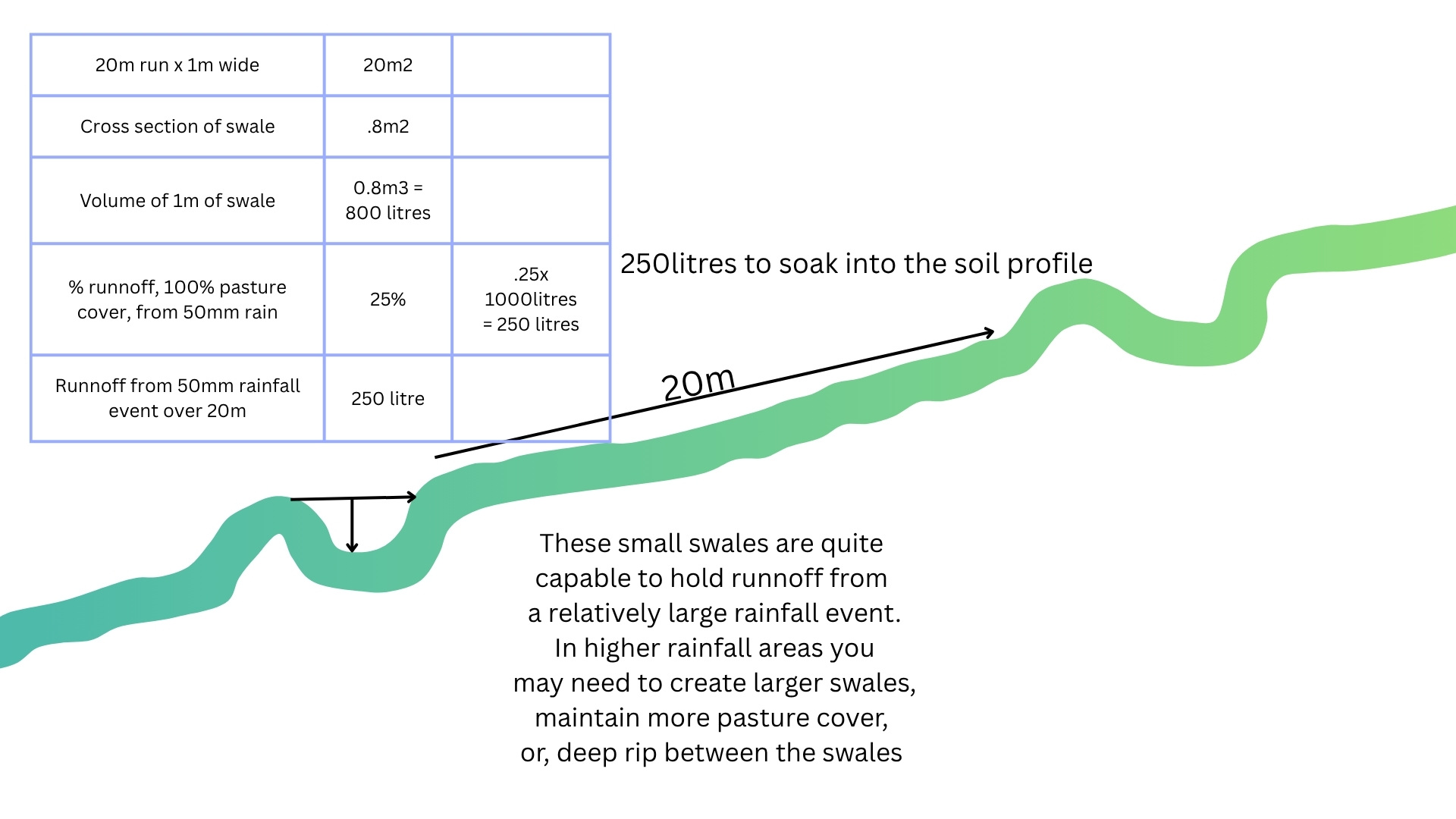 This spacing of 25 to 30m creates adequate grazing cells for our system. Larger numbers of cattle may require wider swale spacing and reduced grazing time in each cell.