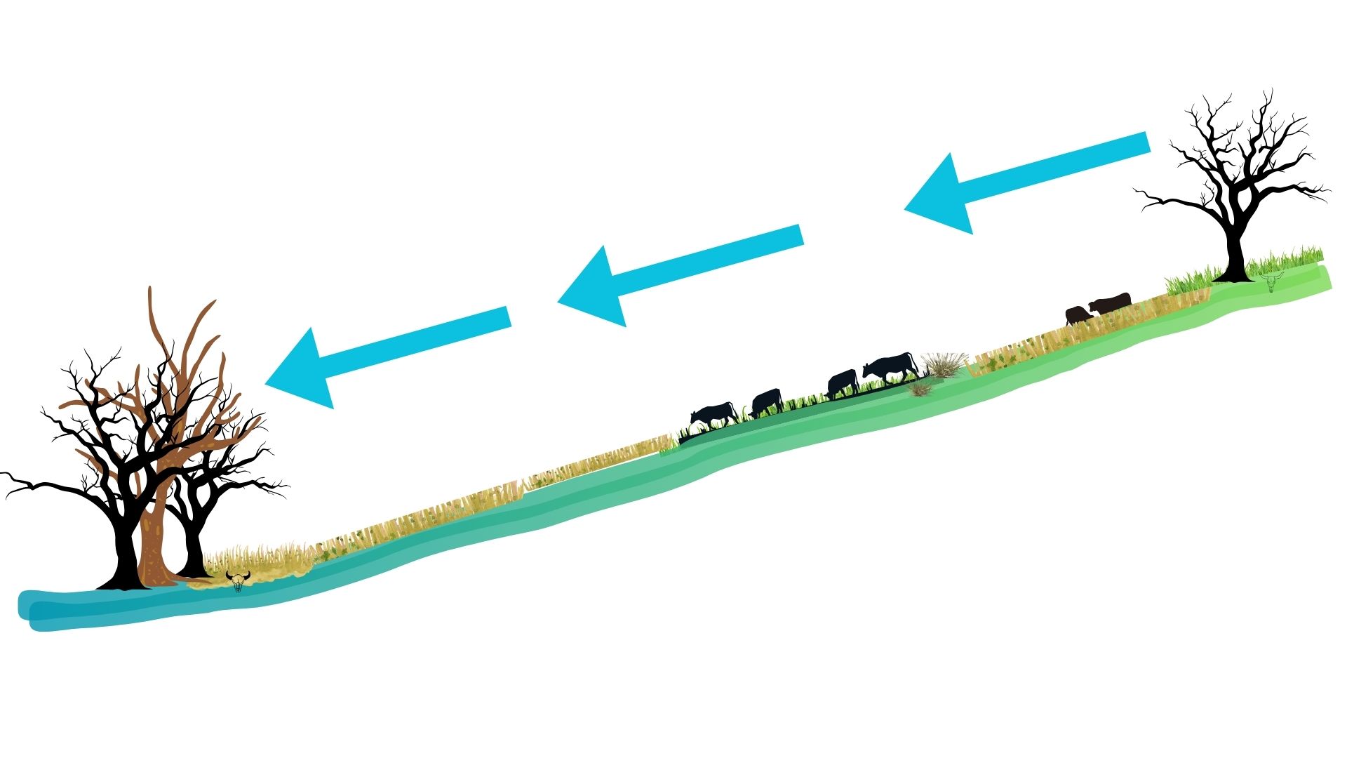 The reduction of ground cover increased the runnoff from rainfall events. The quicker downhill flow collected more manure carrying nutrients and reduced the time available for soil infiltration. These dissolved nutrients slowly migrate to the Murray River, where they increase chances of toxic algae blooms, and then out to the sea.