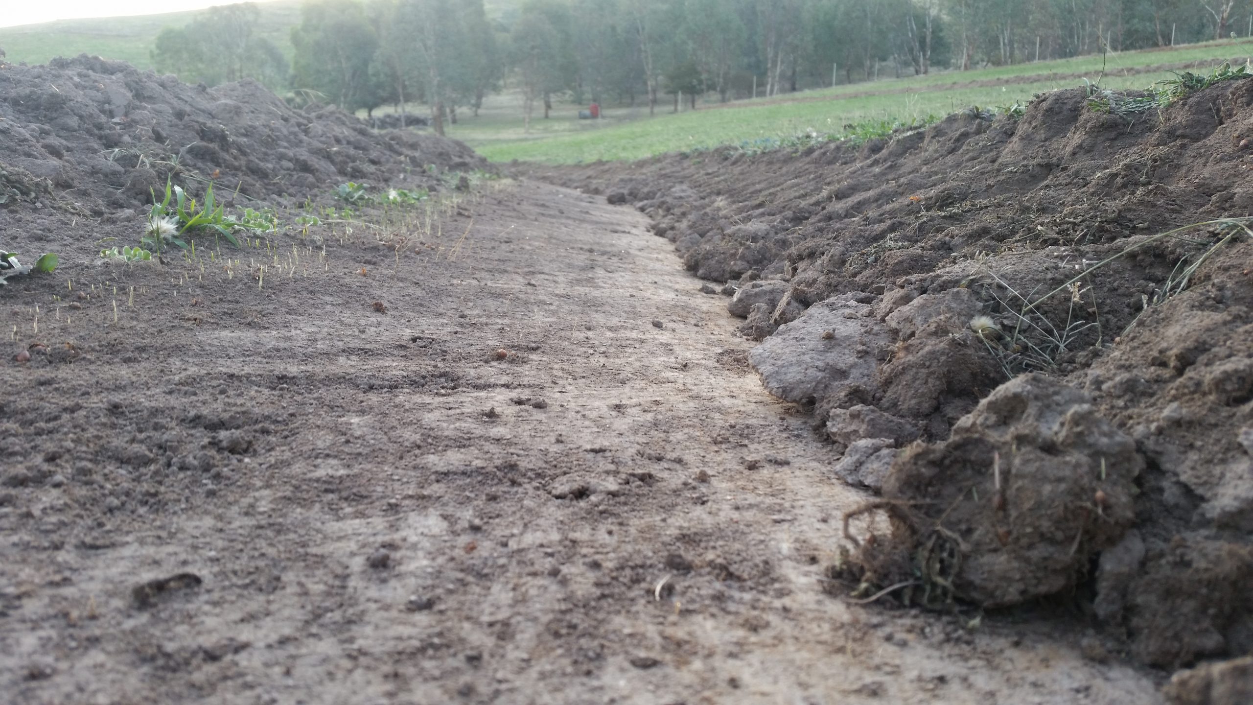 The second pass digs the swale deeper and builds up the volume of soil on the berm. It leaves the swale somewhat rough and in need of another pass to form a larger, even berm.