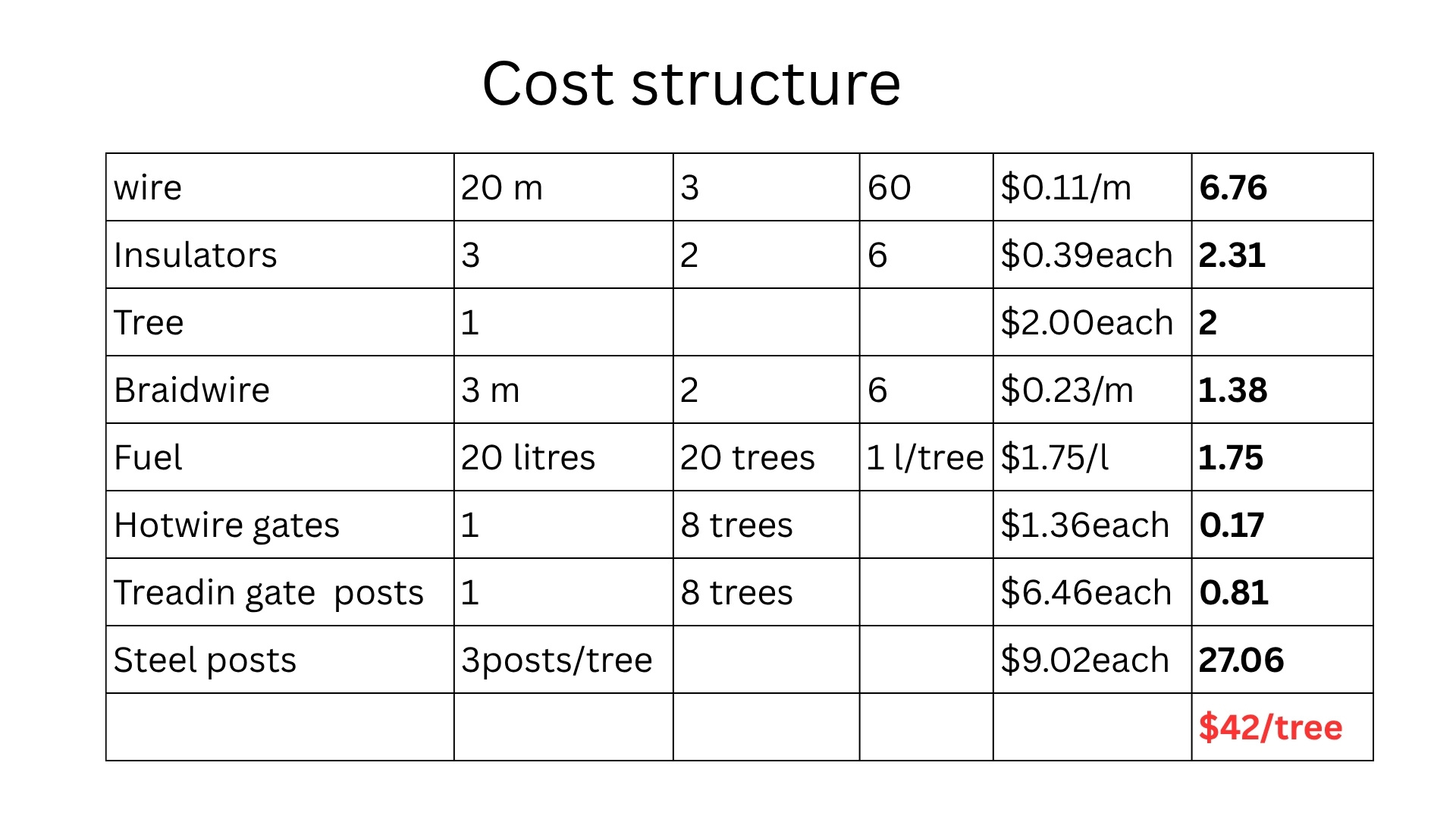 The 20m tree spacing spreads out the steel posts spaces. I add another post between the trees to give an average post spacing of 10m.